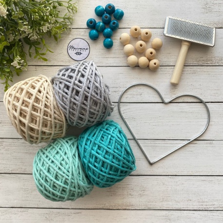 1 ovillo menta polycotton peinado 3mm 100gr. (50m aprox) 1 ovillo turquesa polycotton peinado 3mm 100gr. (50m aprox) 1 ovillo gris perla polycotton peinado 3mm 100gr. (50m aprox) 1 ovillo crudo algodón peinado 3mm 100gr. (50m aprox) 1 corazón 15cm. 1 peine. 10 cuencas turquesa 18mm. 10 cuencas natural 20mm.