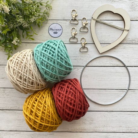 1 ovillo menta polycotton peinado 3mm 100gr. (50m aprox) 1 ovillo amarillo oro polycotton peinado 3mm 100gr. (50m aprox) 1 ovillo terracota polycotton peinado 3mm 100gr. (50m aprox) 1 ovillo crudo algodón peinado 3mm 100gr. (50m aprox) 4 mosquetones. 1 molde para cortar hojas 13,5cm. 1 argolla circular 14cm.